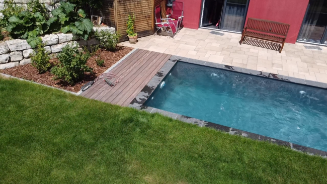 Salzpool 3x7x1,80 m in Stegaurach Privatgarten realisiert 2021 Bau in einem bestehenden Garten Bau eines Technikhauses und Einwinterungsschacht verbaute Elemente sind Gegenstromanlage, Unterflurrollo, Luftwärmepumpe, Unterwasserscheinwerfer Alle Arbeiten wurden durch Galabau Bierschenk „Alles aus einer Hand“ durchgeführt, angefangen von den Erdarbeiten, über die Betonplatte, Mauerungen, Kernlochbohrungen, Verputzarbeiten, Abdeckplatten, Verbau der Folie und Technik, vegetationstechnische Arbeiten, Rollrasenverlegung, belagsarbeiten,…
